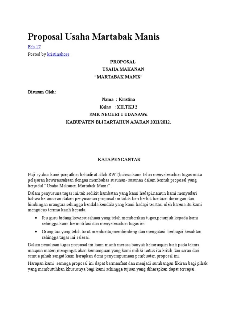 Berikut proposal usaha yang kami buat, check . "martabak mie renyah" itulah nama yang saya berikan untuk kegiatan usaha ini, yang bergerak di bidang makanan ringan. Usaha makanan ringan baru sebagai penambah margin. 9 daftar pustaka lampiran proposal usaha martabak manis mini halaman 3. Proposal ini merupakan tahap awal kami dalam memulai usaha martabak manis mini.